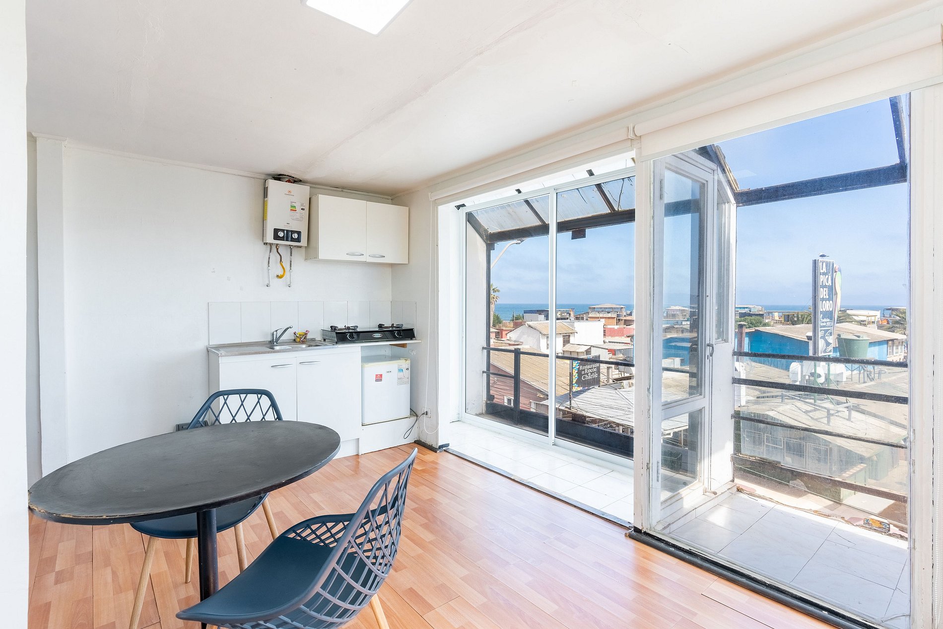 Departamento para 2 personas con terraza y vista al mar, cuenta con dormitorio principal con baño privado , y un living con una hermosa vista al mar. Está totalmente equipado. La propiedad cuenta con estacionamiento